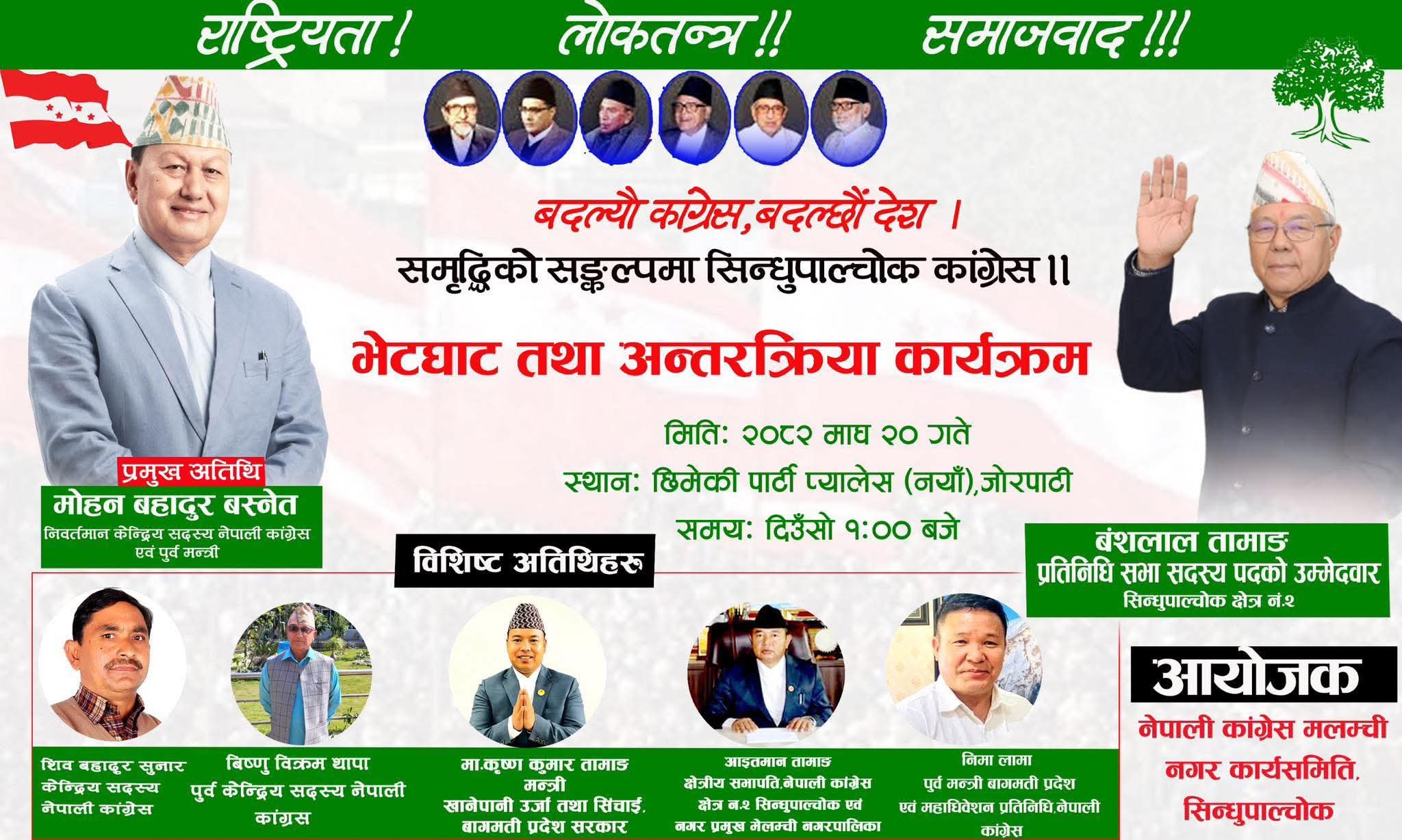 नेपाली कांग्रेस मेलम्ची नगर कमिटीको आयोजनामा हुने उक्त कार्यक्रम जोरपाटीस्थित छिमेकी पार्टी प्यालेसमा सम्पन्न हुनेछ। सिन्धुपाल्चोक क्षेत्र नं. १ बाट उम्मेदवार बन्न आकांक्षा राखेका मोहनबहादुर बस्नेत, पछि पार्टी सभापति जंगबहादुर लामा उम्मेदवार बनेपछि पार्टीका आधिकारिक उम्मेदवारहरूलाई जिताउन सक्रिय रूपमा लागिपरेका छन्। यही क्रममा उनी सिन्धुपाल्चोक क्षेत्र नं. २ का उम्म